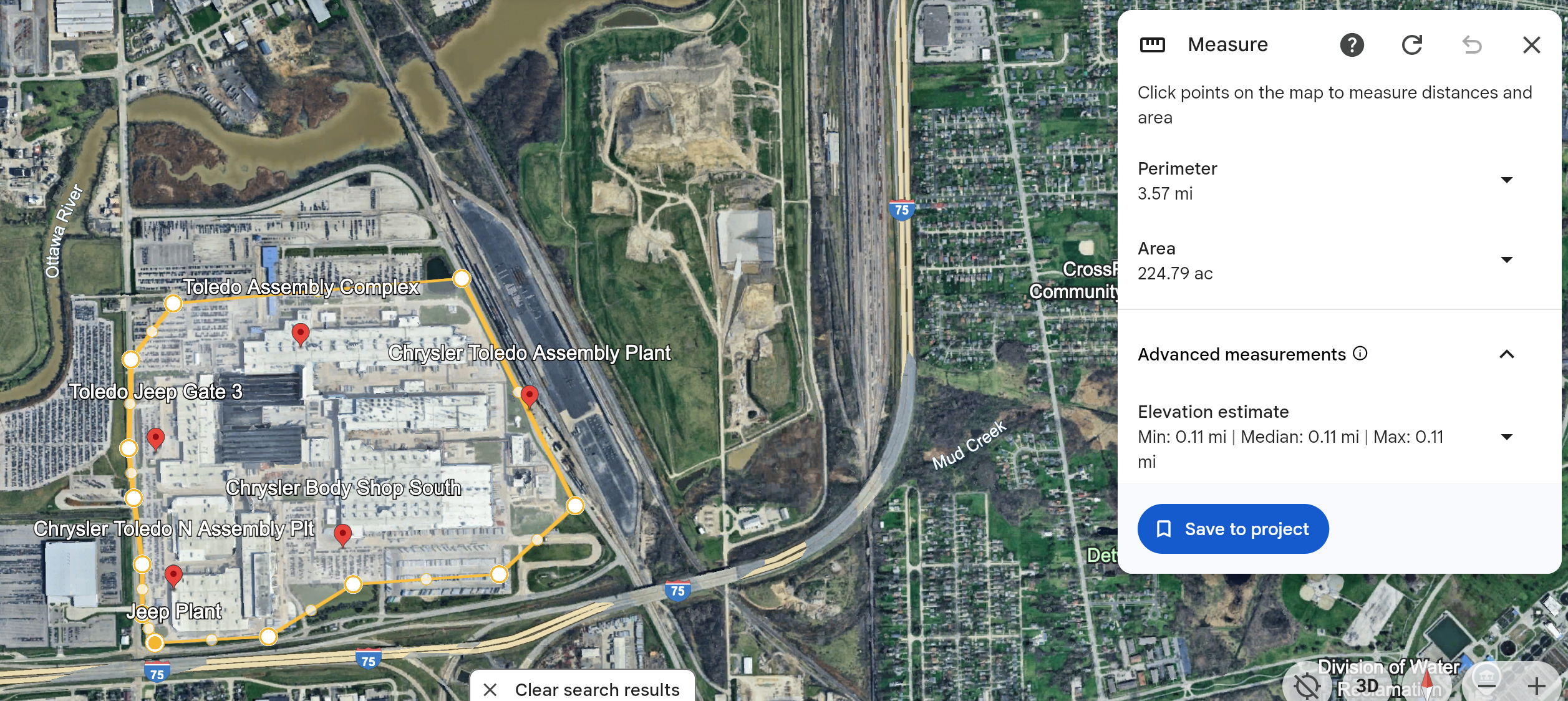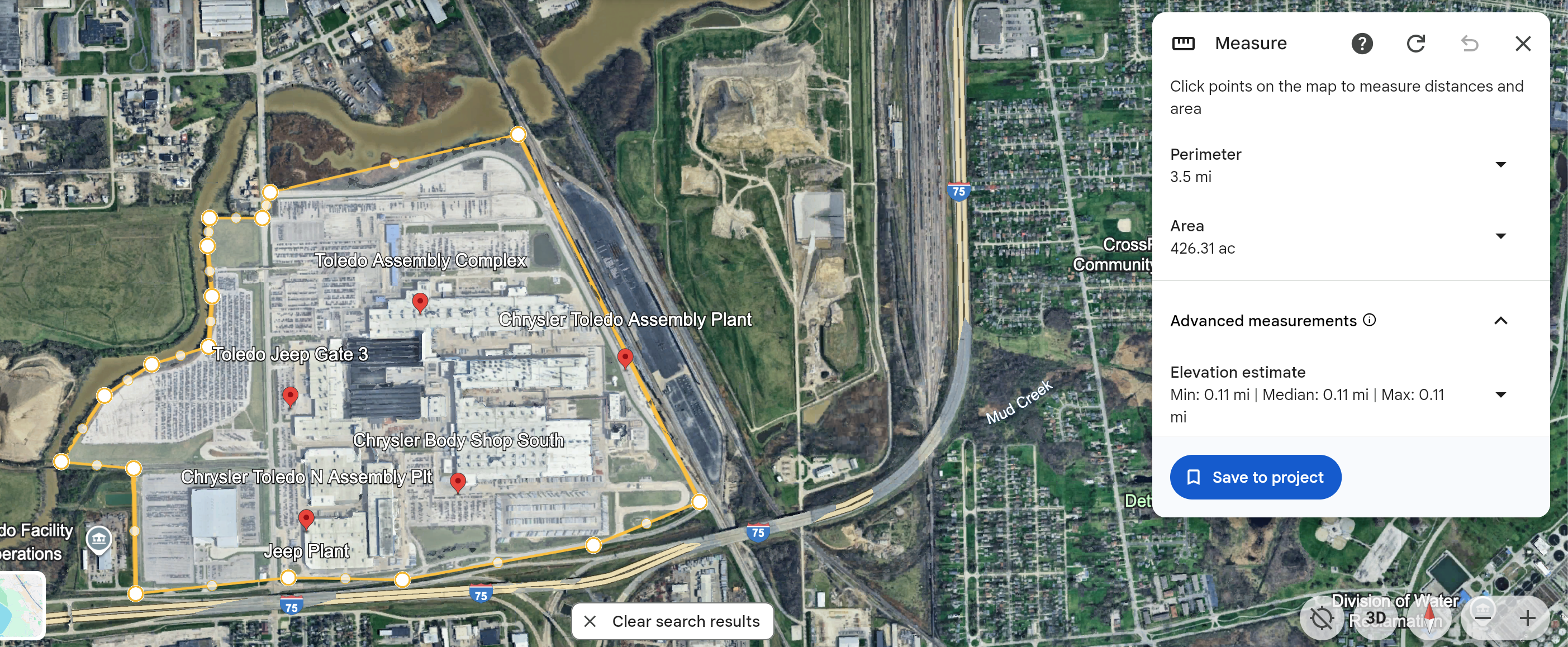 Here is the area of the entire Chrysler Jeep campus in Toledo(below). It's approximately 400 acres if you remove the county owned easements. Everyone in Northwest Ohio knows how big that campus is. It takes about a minute to drive past it at 70mph on I-75. Its a huge facitlity.