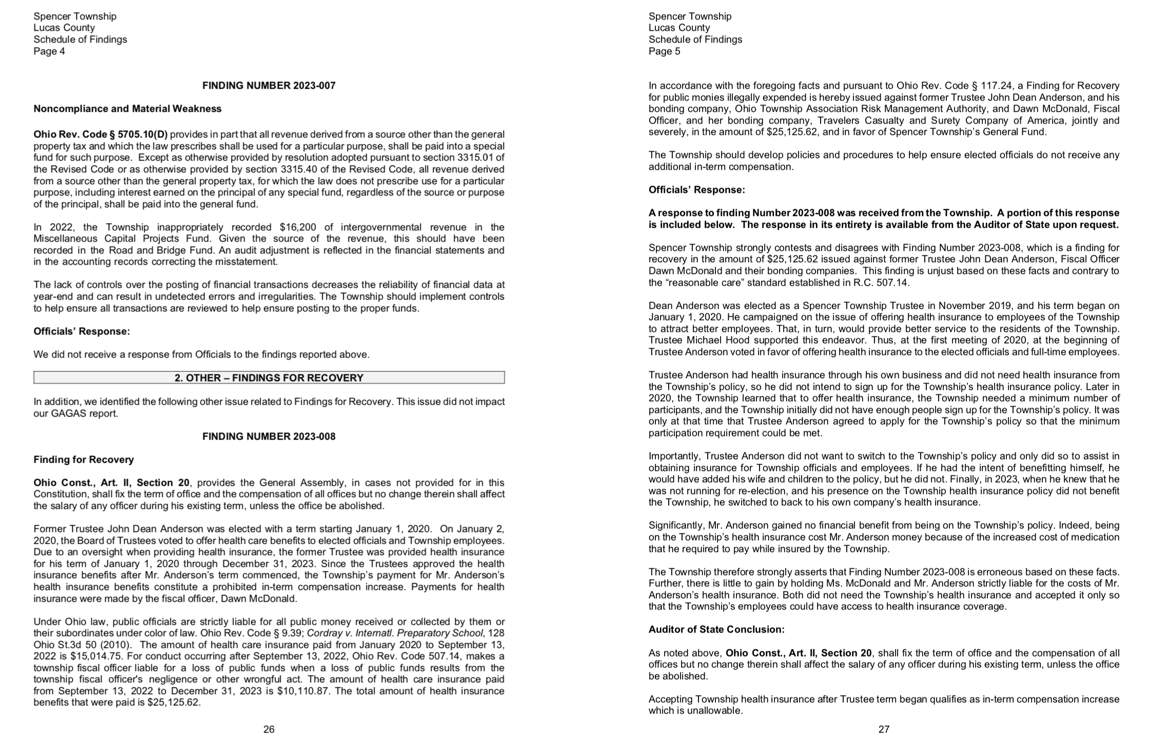 A state financial audit of Spencer Township released August 8th,2025 has identified reoccurring financial noncompliance, questionable contract arrangements, open meeting violations, lack of internal financial controls, noncompliance of competitive bidding statutes, illegal health insurance payments for Township Officers and mismanagement of Taxpayers dollars.