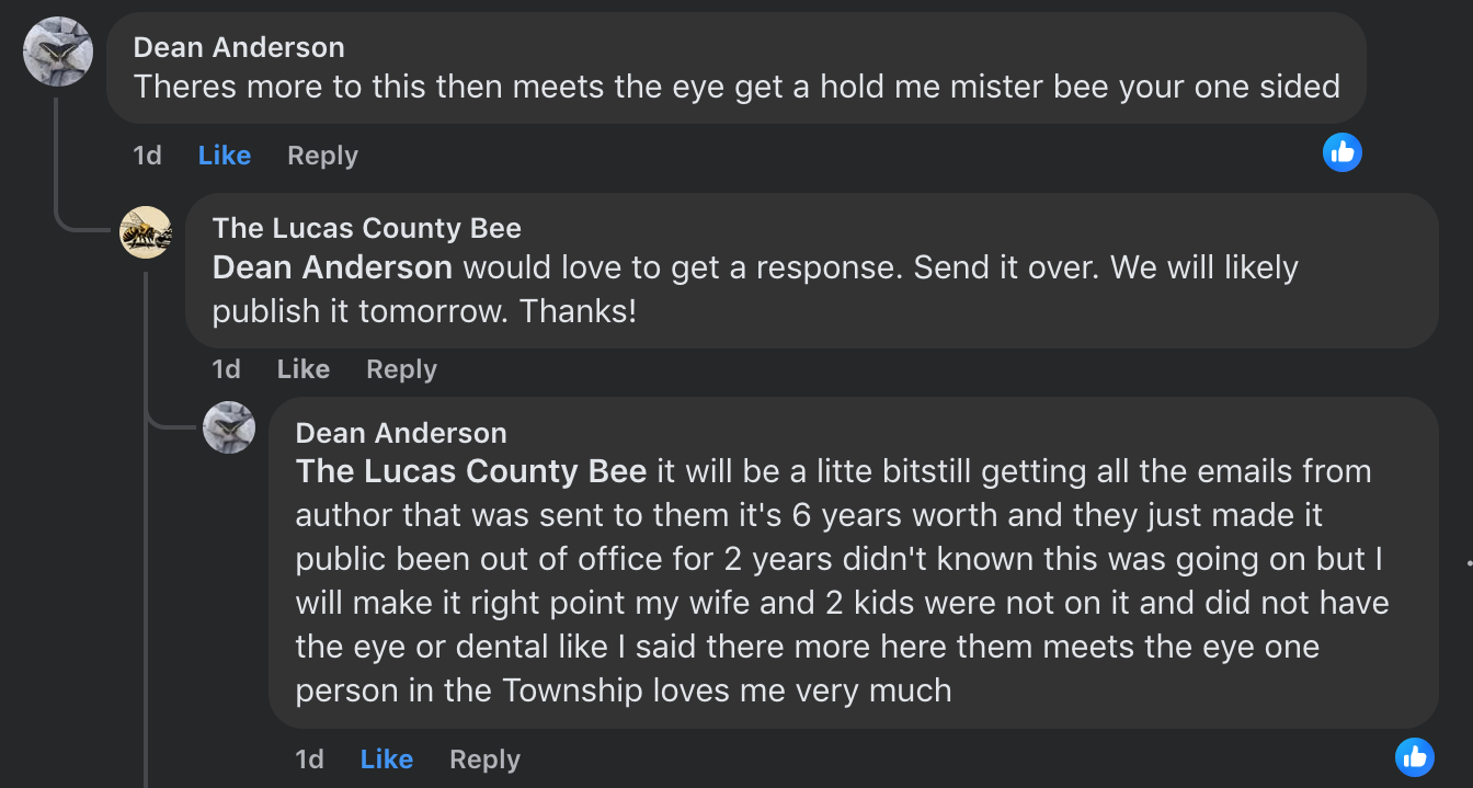 Anderson had been quoted by The Blade in an article dated December 20", 2022. When asked about the finding. Mr. Anderson , "I do not need the township's money," he said. "I don't need to steal money from the township." Spencer Township Trustees Hood, Kester and Havens responded to the State Auditor's findings declaring the Trustees, "strongly contests and disagrees with Finding Number 2023-008, which is a finding for recovery in the amount of $25,125.62 issued against former Trustee John Dean Anderson, Fiscal Officer Dawn McDonald" Township Officers continued their protest claiming "This finding is unjust" The State Auditor responded to the current Twp Officers protest stating, "Ohio Const., Art. II, Section 20, shall fix the term of office and the compensation of all offices but no change therein shall affect the salary of any officer during his existing term, unless the office be abolished. Accepting Township health insurance after Trustee term began qualifies as in-term compensation increase which is unallowable."
